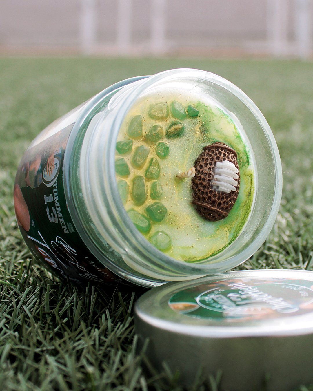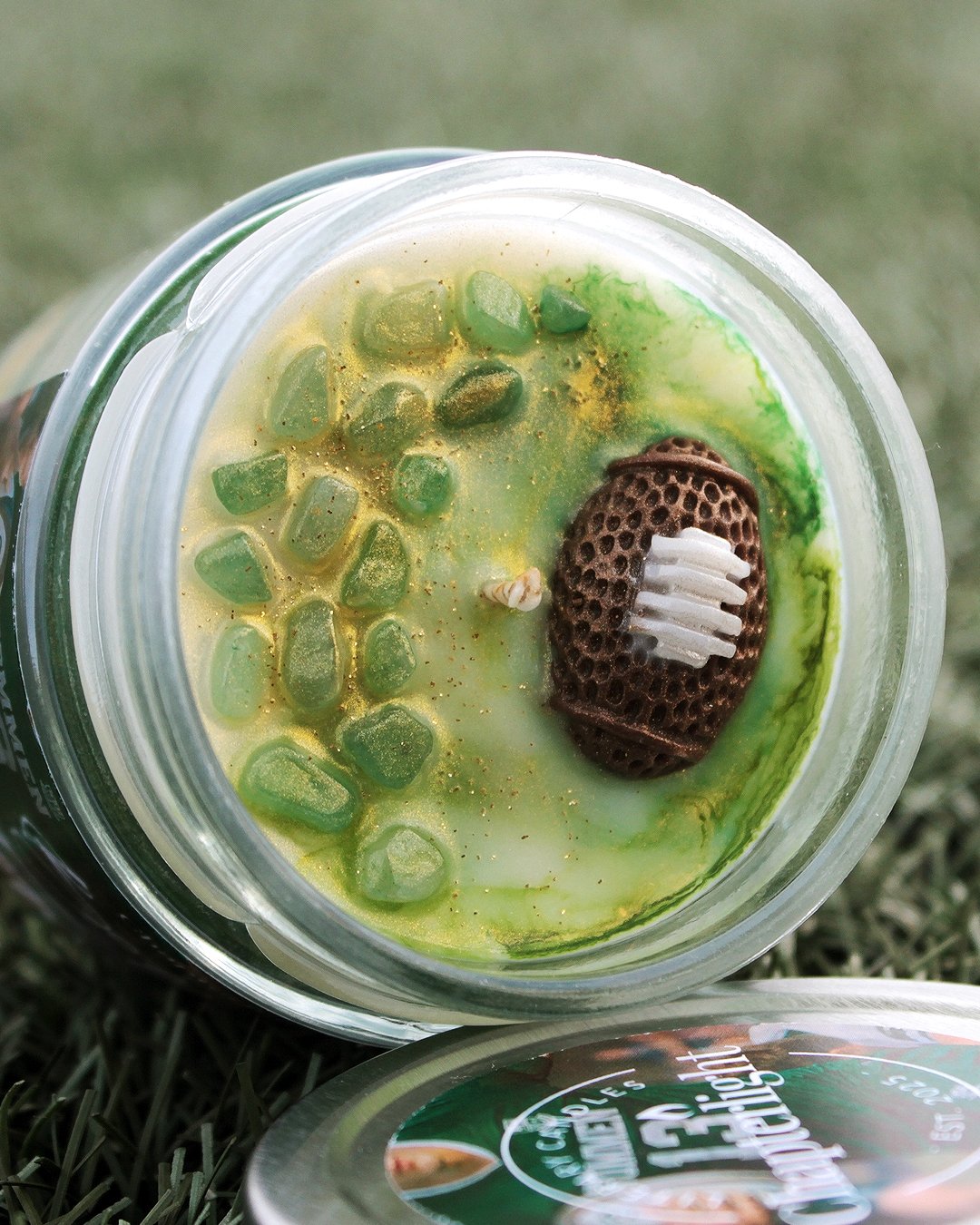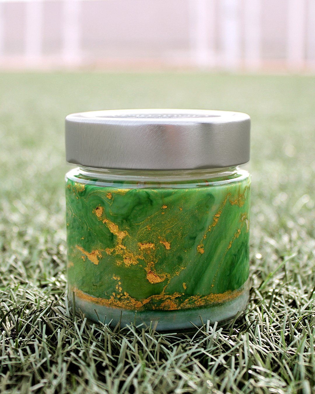 - Versión decorada: tarro con efecto marmolado en tonos verdes y dorados. Su superficie se decora a mano con una pelota de rugby y múltiples piedras de aventurina, conocidas por aportar equilibrio, calma y buena energía.