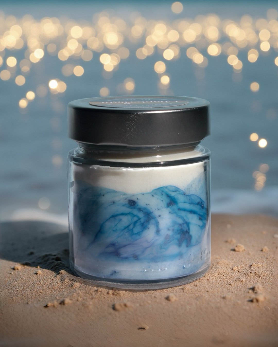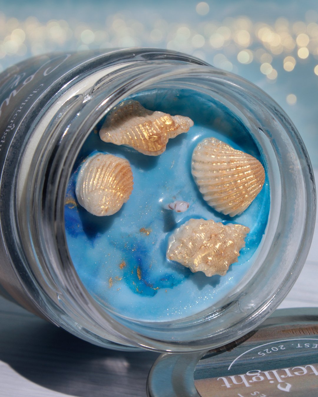 - Versión decorada: tarro con un delicado efecto marmolado que recuerda a las olas del mar, y superficie adornada con pequeñas conchas, evocando el espíritu veraniego.