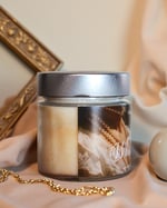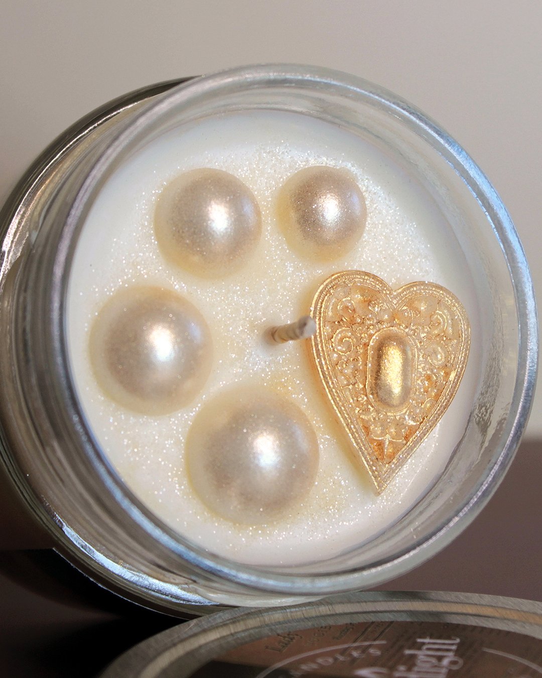 - Versión decorada: tarro con sutil brillo de mica dorada. Su superficie se adorna a mano con perlas, un broche en forma de corazón y un toque de glitter biodegradable, evocando lujo y elegancia.